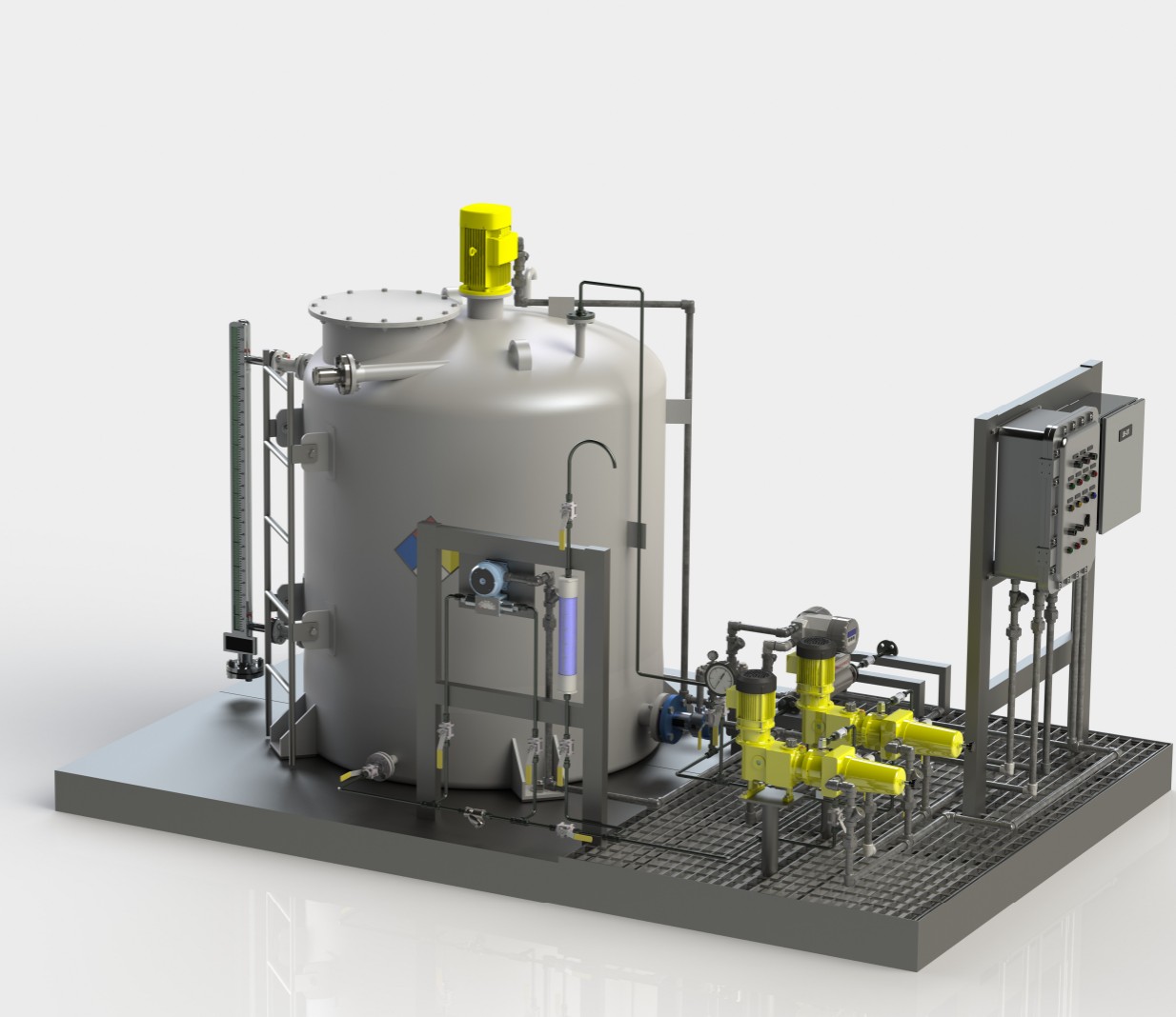 Chemical injection skids include a metal platform with one or more tanks containing the product to be injected, one or more dosing pumps to supply the flow and several instruments to monitor tank levels and measure and control the flow, as well as local or remote monitoring of the different process variables. It should be noted that these systems are designed, integrated and assembled locally according to the customer’s needs and specifications.